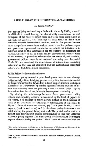 Bradley, M. Frank (1983) A Public Policy for International Marketing. Irish Business and Administration Research, 5 (2): 6. pp. 57-75. ISSN 0332-1118
