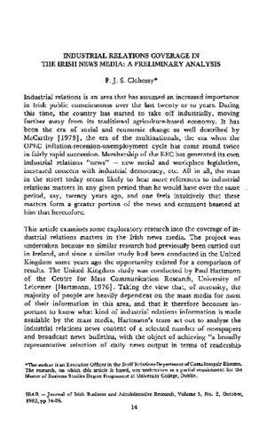 Clohessy, P. J. S. (1983) Industrial Relations Coverage in the Irish News Media: A Preliminary Analysis. Irish Business and Administrative Research, 5 (2): 2. pp. 14-26. ISSN 0332-1118