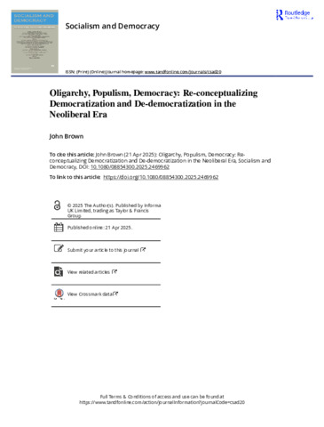 Brown, John (2025) Oligarchy, Populism, Democracy: Re-conceptualizing Democratization and De-democratization in the Neoliberal Era. Socialism and Democracy. pp. 1-23. ISSN 0885-4300