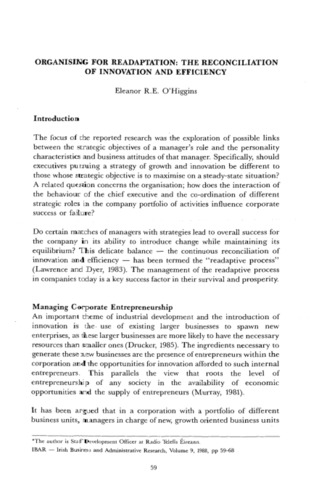 O'Higgins, Eleanor R.E. (1988) Organising for Readaptation: The Reconciliation of Innovation and Efficiency. Irish Business and Administrative Research, 9 (1): 7. pp. 59-68. ISSN 0332-1118