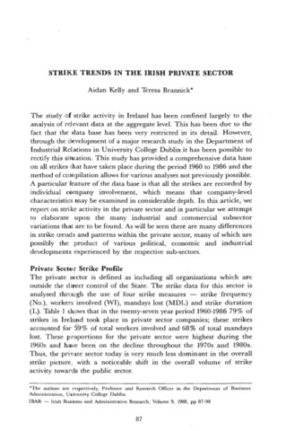 Kelly, Aidan and Brannick, Teresa (1988) Strike Trends in the Irish Private Sector. Irish Business and Administrative Research, 9 (1): 10. pp. 87-98. ISSN 0332-1118