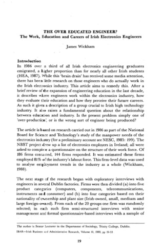 Wickham, James (1989) The Over Educated Engineer? Irish Business and Administrative Research, 10 (1): 3. pp. 19-33. ISSN 0332-1118