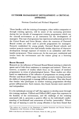 Crawford, Norman and Mapstone, Richard (1989) Outdoor Management Development: A Critical Appraisal. Irish Business and Administrative Research, 10 (1): 6. pp. 59-65. ISSN 0332-1118