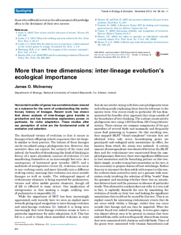 McInerney, James O. (2013) More than tree dimensions: inter-lineage evolution's ecological importance. Trends in Ecology & Evolution, 28 (11). pp. 624-625. ISSN 0169-5347