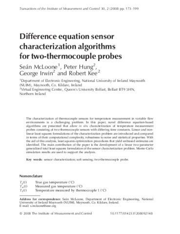 McLoone, Seán, Hung, Peter, Irwin, George and Kee, Robert (2008) Difference equation sensor characterization algorithms for two-thermocouple probes. Transactions of the Institute of Measurement and Control, 30 (2). pp. 173-199. ISSN 0142-3312