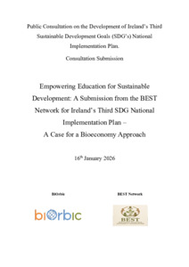 This submission from the Bioeconomy Education and Sustainability Teachers (BEST) Network contributes to the public consultation on Ireland’s Third Sustainable Development Goals (SDGs) National Implementation Plan (NIP). It positions Education for Sustainable Development (ESD), aligned with SDG Target 4.7, as a central delivery mechanism for achieving Ireland’s SDG commitments. The submission makes the case for embedding a bioeconomy approach across education systems to support systems thinking, circularity, ecological limits and a just transition. It highlights gaps in current curriculum integration, educator capacity and coordination across policy frameworks. Key recommendations include national leadership for SDG education, sustained funding and formal integration of bioeconomy competencies from early years through higher and adult education. The submission emphasises the critical role of initial teacher education and continuing professional development. It also calls for meaningful youth participation and whole-school and community-based approaches. Finally, it recommends education-specific SDG indicators and reporting to ensure measurable impact. Collectively, these actions would embed education as a core pillar of Ireland’s sustainable development strategy.