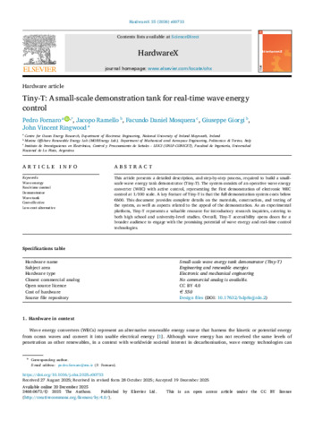 Fornaro, Pedro, Ramello, Jacopo, Mosquera, Facundo Daniel, Giorgi, Giuseppe and Ringwood, John (2026) Tiny-T: A small-scale demonstration tank for real-time wave energy control. HardwareX, 25. e00733. ISSN 2468-0672