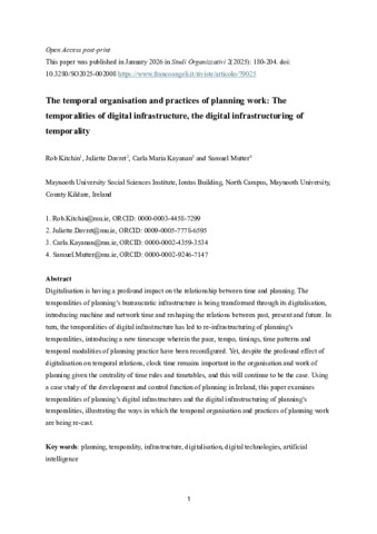 Kitchin, Rob, Davret, Juliette, Maria Kayanan, Carla and Mutter, Samuel (2025) The temporal organisation and practices of planning work: The temporalities of digital infrastructure, the digital infrastructuring of temporality. Studi Organizzativi (2). pp. 180-204. ISSN 0391-8769