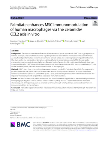 Tunstead, Courteney, Bitterlich, Laura M., Ankrum, James A., Hogan, Andrew E. and English, Karen (2025) Palmitate enhances MSC immunomodulation of human macrophages via the ceramide/CCL2 axis in vitro. Stem Cell Research & Therapy, 16 (1). ISSN 1757-6512