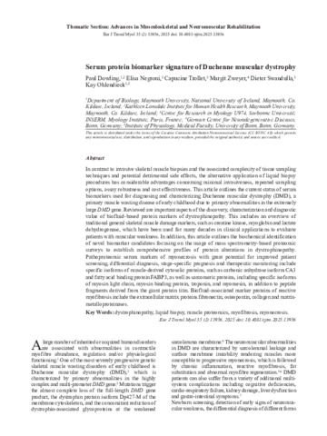 Dowling, Paul, Negroni, Elisa, Trollet, Capucine, Zweyer, Margit, Swandulla, Dieter and Ohlendieck, Kay (2025) Serum protein biomarker signature of Duchenne muscular dystrophy. European journal of translational myology, 35 (2). ISSN 2037-7452