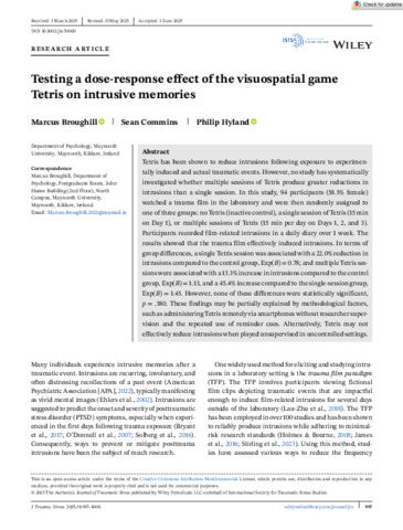 Broughill, Marcus, Commins, Sean and Hyland, Philip (2025) Testing a dose‐response effect of the visuospatial game Tetris on intrusive memories. Journal of Traumatic Stress, 38 (6). pp. 997-1008. ISSN 0894-9867