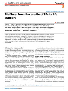 Baxter, Katherine J., Sas, Eszter, Clark, Kevin B., Walsh, Michaela, Pradeep, Nikhil, Batool, Alavia, Naney, Charles, Vargas Cruz, Miguel Angel, Kennerdale, Niamh, Das, Kajari, Shi, Zhihan, Kelam, Anish, Verma, Vandana, Simões, Marta Filipa, Neefs, Dirk, Ravichandran, Vinothkannan, Tirumalai, Madhan R., Barcenilla, Borja Barbero, Macori, Guerrino, Gonzalez, Emmanuel, Sikes, Benjamin, Karouia, Fathi and Brereton, Nicholas J. B. (2026) Biofilms: from the cradle of life to life support. npj Biofilms and Microbiomes, 12 (1). ISSN 2055-5008