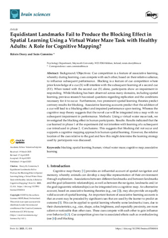 Deery, Róisín and Commins, Sean (2025) Equidistant Landmarks Fail to Produce the Blocking Effect in Spatial Learning Using a Virtual Water Maze Task with Healthy Adults: A Role for Cognitive Mapping? Brain sciences, 15 (4). ISSN 2076-3425
