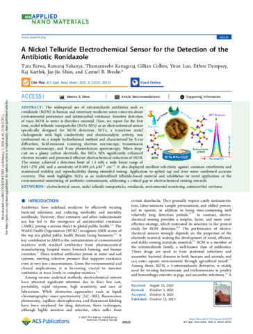 Barwa, Tara, Sukanya, Ramaraj, Kanagaraj, Thamaraiselvi, Collins, Gillian, Luo, Yiran, Dempsey, Eithne, Karthik, Raj, Shim, Jae-Jin and Breslin, Carmel B. (2025) A Nickel Telluride Electrochemical Sensor for the Detection of the Antibiotic Ronidazole. ACS Applied Nano Materials, 8 (42). pp. 20523-20533. ISSN 2574-0970