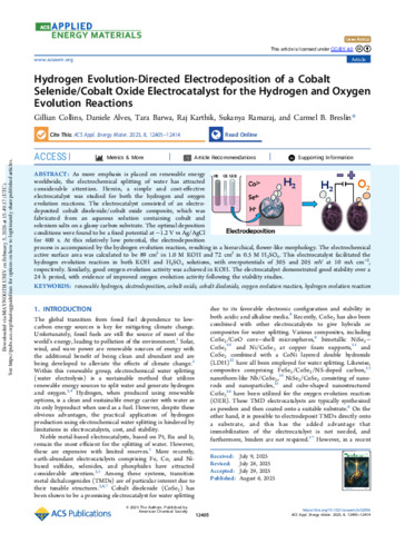 Collins, Gillian, Alves, Daniele C. da Silva, Barwa, Tara, Karthik, Raj, Ramaraj, Sukanya and Breslin, Carmel B. (2025) Hydrogen Evolution-Directed Electrodeposition of a Cobalt Selenide/Cobalt Oxide Electrocatalyst for the Hydrogen and Oxygen Evolution Reactions. ACS Applied Energy Materials, 8 (16). pp. 12405-12414. ISSN 2574-0962