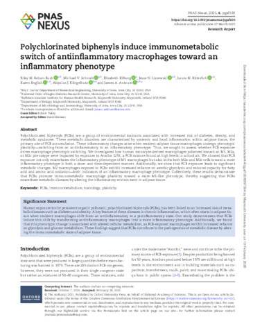 Behan-Bush, Riley M, Schrodt, Michael V, Kilburg, Elizabeth, Liszewski, Jesse N, Bitterlich, Laura M, English, Karen, Klingelhutz, Aloysius J and Ankrum, James A (2025) Polychlorinated biphenyls induce immunometabolic switch of antiinflammatory macrophages toward an inflammatory phenotype. PNAS Nexus, 4 (4). ISSN 2752-6542