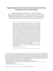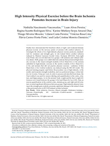 Vasconcelos, Nathália Nascimento, Pereira, Luan Alves, Silva, Regina Suzette Rodrigues, Dias, Karine Sthéfany Serpa Amaral, Mourão, Thiago Silveira, Pereira, Liliane Costa, Cota, Vinícius Rosa, Pinto, Flávia Carmo Horta and Damázio, Laila Cristina Moreira (2021) High Intensity Physical Exercise before the Brain Ischemia Promotes Increase in Brain Injury. Journal of Stroke and Cerebrovascular Diseases, 30 (12): 106148. pp. 1-10. ISSN 10523057