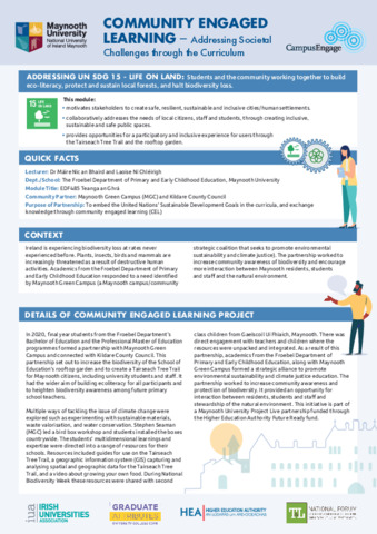 Ireland is experiencing biodiversity loss at rates never experienced before. Plants, insects, birds and mammals are increasingly threatened as a result of destructive human activities. Academics from the Froebel Department of Primary and Early Childhood Education responded to a need identified by Maynooth Green Campus (a Maynooth campus/community strategic coalition that seeks to promote environmental sustainability and climate justice). The partnership worked to increase community awareness of biodiversity and encourage more interaction between Maynooth residents, students and staff and the natural environment. In 2020, final-year Froebel BEd and PME students partnered with Maynooth Green Campus and Kildare County Council to enhance biodiversity through a rooftop garden and the creation of the Tairseach Tree Trail for the wider Maynooth community. Students explored climate action through sustainable materials, waste valorisation, water conservation, and biodiversity initiatives, producing educational resources including GIS mapping, trail guides, and food-growing materials shared during National Biodiversity Week. The project led to a strategic alliance between the Froebel Department and Maynooth Green Campus, strengthening community engagement, ecoliteracy, and climate justice education through a HEA Future Ready–funded Project Live partnership.