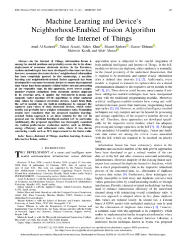 Al-Rasheed, Amal, Alsaedi, Tahani, Khan, Rahim, Rathore, Bharati, Dhiman, Gaurav, Kundi, Mahwish and Ahmad, Aftab (2025) Machine Learning and Device’s Neighborhood-Enabled Fusion Algorithm for the Internet of Things. IEEE Transactions on Consumer Electronics, 71 (1). pp. 467-475. ISSN 0098-3063