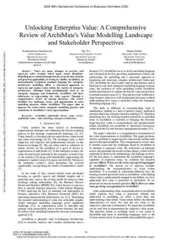 Shankaravelu, Karthickeshwar, Wu, Hao and Helfert, Markus (2024) Unlocking Enterprise Value: A Comprehensive Review of ArchiMate’s Value Modelling Landscape and Stakeholder Perspectives. 26th International Conference on Business Informatics (CBI). pp. 10-19.