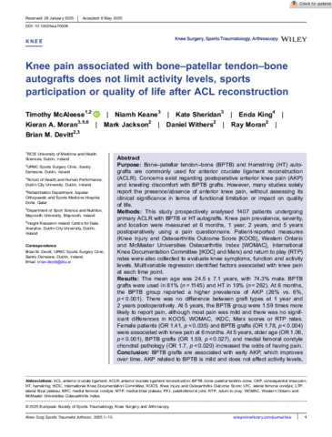 McAleese, Timothy, Keane, Niamh, Sheridan, Kate, King, Enda, Moran, Kieran, Jackson, Mark, Withers, Daniel, Moran, Ray and Devitt, Brian M. (2025) Knee pain associated with bone–patellar tendon–bone autografts does not limit activity levels, sports participation or quality of life after ACL reconstruction. Knee Surgery, Sports Traumatology, Arthroscopy. pp. 1-13. ISSN 0942-2056