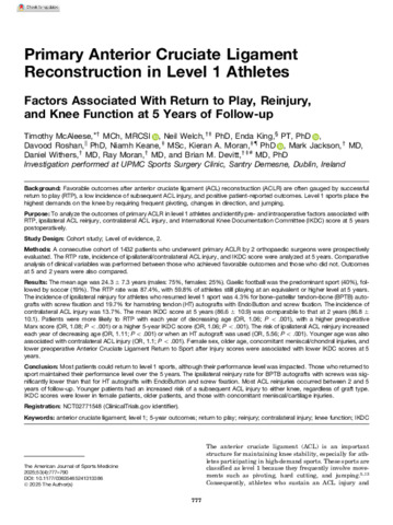 McAleese, Timothy, Welch, Neil, King, Enda, Roshan, Davood, Keane, Niamh, Moran, Kieran, Jackson, Mark, Withers, Daniel, Moran, Ray and Devitt, Brian M. (2025) Primary Anterior Cruciate Ligament Reconstruction in Level 1 Athletes: Factors Associated With Return to Play, Reinjury, and Knee Function at 5 Years of Follow-up. The American Journal of Sports Medicine, 53 (4). pp. 777-790. ISSN 0363-5465