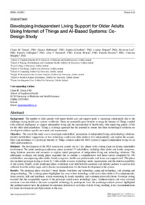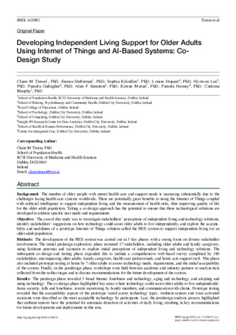 Timon, Claire M, Heffernan, Emma, Kilcullen, Sophia, Hopper, Louise, Lee, Hyowon, Gallagher, Pamela, Smeaton, Alan F, Moran, Kieran, Hussey, Pamela and Murphy, Catriona (2024) Developing Independent Living Support for Older Adults Using Internet of Things and AI-Based Systems: Co-Design Study. JMIR Aging, 7. e54210-e54210. ISSN 2561-7605