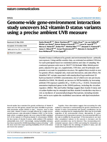 Shraim, Rasha, Timofeeva, Maria, Wyse, Cathy, van Geffen, Jos, van Weele, Michiel, Romero-Ortuno, Roman, Lopez, Lorna M., Kleber, Marcus E., Pilz, Stefan, März, Winfried, Fletcher, Benjamin S., Wilson, James F., Theodoratou, Evropi, Dunlop, Malcolm G., McManus, Ross and Zgaga, Lina (2025) Genome-wide gene-environment interaction study uncovers 162 vitamin D status variants using a precise ambient UVB measure. Nature Communications, 16 (1). ISSN 2041-1723