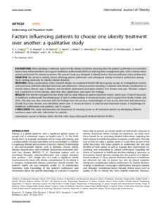 Craig, H. C., Alsaeed, D., Al Ozairi, E., Norris, S., Holian, J., Kennedy, C., Heneghan, H., McGillicuddy, D., Farrell, Emma, Hollmann, E., Al-Najim, W. and le Roux, C. W. (2025) Factors influencing patients to choose one obesity treatment over another: a qualitative study. International Journal of Obesity, 49 (8). pp. 1554-1565. ISSN 0307-0565