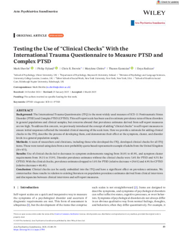 Shevlin, Mark, Hyland, Philip, Brewin, Chris R., Cloitre, Marylene, Karatzias, Thanos and Redican, Enya (2025) Testing the Use of “Clinical Checks” With the International Trauma Questionnaire to Measure PTSD and Complex PTSD. Acta Psychiatrica Scandinavica, 152 (1). pp. 49-59. ISSN 0001-690X