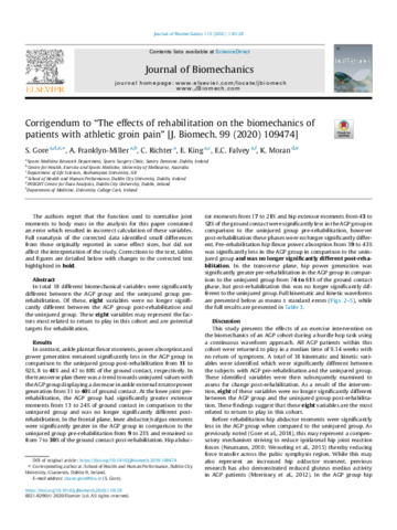Gore, S., Franklyn-Miller, A., Richter, C., King, E., Falvey, E.C. and Moran, Kieran (2021) Corrigendum to “The effects of rehabilitation on the biomechanics of patients with athletic groin pain” [J. Biomech. 99 (2020) 109474]. Journal of Biomechanics, 115: 110128. pp. 1-4. ISSN 00219290