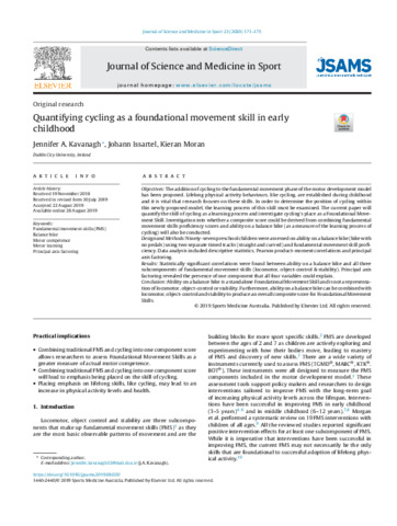 Kavanagh, Jennifer A., Issartel, Johann and Moran, Kieran (2020) Quantifying cycling as a foundational movement skill in early childhood. Journal of Science and Medicine in Sport, 23 (2). pp. 171-175. ISSN 1440-2440