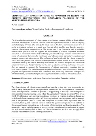 Van Staden, Wilma (2020) Climate-smart innovation tool: An Approach to review the climate responsiveness and innovation practices of the Agricultural Curricula. South African Journal of Agriculture Extension, 48 (1). pp. 42-54. ISSN 2413-3221