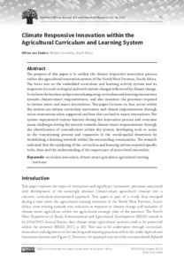 The purpose of this paper is to outline the climate responsive innovation process within the agricultural innovation system of the North West Province, South Africa. The focus was on the embedded curriculum and learning activity system and its responses to social-ecological and earth system changes influenced by climate change. It outlines the barriers and processes hampering curriculum and learning innovations towards climate-smart responsiveness, and also examines the processes required to initiate micro and macro innovations. This paper focusses on how actors within the system can initiate curriculum innovation and climate responsiveness through micro innovations when supported and how this can lead to macro innovations. The system experienced various barriers during the innovation process and overcame many challenges during the journey towards climate-smart responsiveness through the identification of contradictions within the system, developing tools to assist in the transitioning process and expansion in the social-spatial dimension by establishing a learning network within the surrounding communities. The research indicated that the catalysing of the curriculum and learning system required specific tools, time and the understanding of the importance of micro-level innovation.