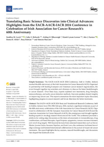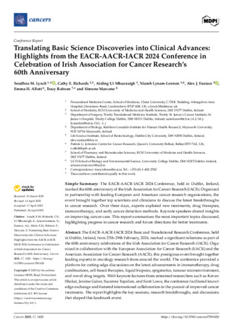 Lynch, Seodhna M., Richards, Cathy E., Ui Mhaonaigh, Aisling, Lynam-Lennon, Niamh, Eustace, Alex J., Allott, Emma H., Robson, Tracy and Marcone, Simone (2025) Translating Basic Science Discoveries into Clinical Advances: Highlights from the EACR-AACR-IACR 2024 Conference in Celebration of Irish Association for Cancer Research’s 60th Anniversary. Cancers, 17 (9). p. 1420. ISSN 2072-6694