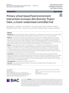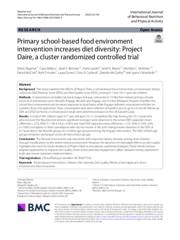 Olgacher, Dilara, Wallace, Ciara, Brennan, Sarah F., Lavelle, Fiona, Moore, Sarah E., McKinley, Michelle C., McCole, Patrick, Hunter, Ruth F., Dunne, Laura, Cardwell, Chris R., McCarthy, Danielle and Woodside, Jayne V. (2025) Primary school-based food environment intervention increases diet diversity: Project Daire, a cluster randomized controlled trial. International Journal of Behavioral Nutrition and Physical Activity, 22 (1). ISSN 1479-5868