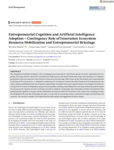 Mostafiz, Md Imtiaz, Ahmed, Farhad Uddin, Ahammad, Mohammad and Rahman, Puteh (2025) Entrepreneurial Cognition and Artificial Intelligence Adoption—Contingency Role of Innovation Ecosystem Resource Mobilization and Entrepreneurial Bricolage. R&D Management. ISSN 1467-9310