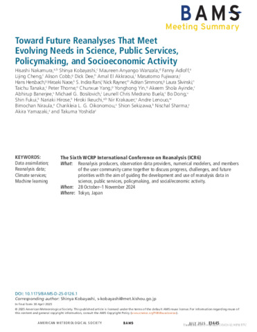 Nakamura, Hisashi, Kobayashi, Shinya, Wanzala, Maureen Anyango, Adloff, Fanny, Cheng, Lijing, Cobb, Alison, Dee, Dick, El Akkraoui, Amal, Fujiwara, Masatomo, Hersbach, Hans, Naoe, Hiroaki, Rani, S. Indira, Rayner, Nick, Simmons, Adrian, Slivinski, Laura, Tanaka, Taichu, Thorne, Peter, Yang, Chunxue, Yin, Yonghong, Ayinde, Akeem Shola, Banerjee, Abhirup, Bosilovich, Michael G., Buela, Leunell Chris Medrano, Dong, Bo, Fukui, Shin, Hirose, Nariaki, Ikeuchi, Hiroki, Krakauer, Nir, Lenouo, Andre, Niraula, Bimochan, Oikonomou, Charikleia L. G., Sekizawa, Shion, Sharma, Nischal, Yamazaki, Akira and Yoshida, Takuma (2025) Toward Future Reanalyses That Meet Evolving Needs in Science, Public Services, Policymaking, and Socioeconomic Activity. Bulletin of the American Meteorological Society, 106 (7). E1445-E1453. ISSN 1520-0477