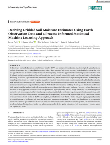Fealy, Rowan, Ishola, Kazeem Abiodun, McCarthy, Tim, Nair, Ajay and de Andrade Moral, Rafael (2026) Deriving Gridded Soil Moisture Estimates Using Earth Observation Data and a Process Informed Statistical Machine Learning Approach. Meteorological Applications, 33 (70142). pp. 1-26. ISSN 1350-4827