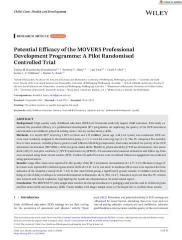 Kazmierska‐Kowalewska, Kalina M., Okely, Anthony D., Siraj, Iram, Archer, Carol, Veldman, Sanne L. C. and Jones, Rachel A. (2025) Potential Efficacy of the MOVERS Professional Development Programme: A Pilot Randomised Controlled Trial. Child: Care, Health and Development, 51 (5). ISSN 0305-1862