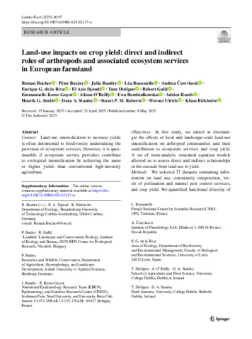 Bucher, Roman, Batáry, Péter, Baudry, Julia, Beaumelle, Léa, Čerevková, Andrea, de la Riva, Enrique G., Djoudi, El Aziz, Dirilgen, Tara, Gallé, Róbert, Kesse-Guyot, Emmanuelle, O’Reilly, Alison, Rembiałkowska, Ewa, Rusch, Adrien, Smith, Henrik G., Stanley, Dara A., Roberts, Stuart P. M., Ulrich, Werner and Birkhofer, Klaus (2025) Land-use impacts on crop yield: direct and indirect roles of arthropods and associated ecosystem services in European farmland. Landscape Ecology, 40 (5). ISSN 1572-9761