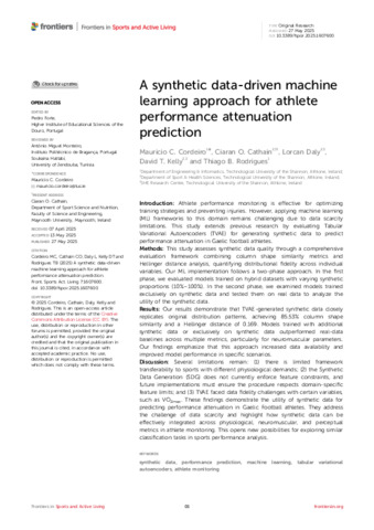 Cordeiro, Mauricio C., Cathain, Ciaran O., Daly, Lorcan, Kelly, David T. and Rodrigues, Thiago B. (2025) A synthetic data-driven machine learning approach for athlete performance attenuation prediction. Frontiers in Sports and Active Living, 7. ISSN 2624-9367