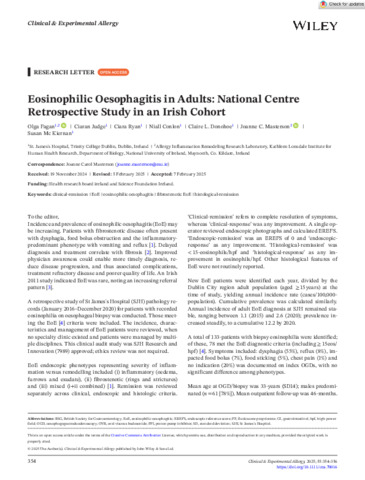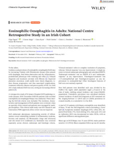 Fagan, Olga, Judge, Ciaran, Ryan, Ciara, Conlon, Niall, Donohoe, Claire L., Masterson, Joanne C. and Kiernan, Susan Mc (2025) Eosinophilic Oesophagitis in Adults: National Centre Retrospective Study in an Irish Cohort. Clinical & Experimental Allergy, 55 (4). pp. 354-356. ISSN 1365-2222
