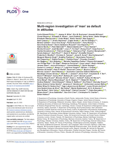 Phills, Curtis Edward, Miller, Jeremy K., Buchanan, Erin M., Williams, Amanda, Meyers, Chanel, Brown, Elizabeth R., Zickfeld, Janis, Volsa, Selina, Stieger, Stefan, Oberzaucher, Elisabeth, Mlakic, Vinka, Vasilev, Martin, Dalgar, İlker, Çoksan, Sami, Söylemez, Sinem, Solak, Çağlar, Özdoğru, Asil Ali, Çoktok, Belemir, Kung, Chun-Chia, Suavansri, Panita, Manley, Harry, Álvarez-Solas, Sara, Ricaurte, Danilo Zambrano, Ropovik, Ivan, Baník, Gabriel, Babinčák, Peter, Adamkovič, Matúš, Kačmár, Pavol, Hricová, Monika, Bavoľár, Jozef, Li, Lisa, Gao, Fei, Chen, Zhong, Ković, Vanja, Gvozdenović, Vasilije, Arriaga, Patrícia, Filip, Katarzyna, Barzykowski, Krystian, Adamus, Sylwia, Pfuhl, Gerit, Martiny, Sarah E., Klevjer, Kristoffer, Woelfert, Frederike S., Tamnes, Christian K., Kunst, Jonas R., Korbmacher, Max, Singh, Margaret Messiah, Pradhan, Sraddha, Parveen, Noorshama, Parganiha, Arti, Pande, Babita, Kujur, Pratibha, Chandel, Priyanka, Reggev, Niv, Mokady, Aviv, Papadatou-Pastou, Marietta, Schnepper, Roxane, Röer, Jan Philipp, Ripp, Tilli, Pronizius, Ekaterina, Lamm, Claus, Voracek, Martin, Olsen, Jerome, Enachescu, Janina, Batres, Carlota, Storage, Daniel, Levitan, Carmel A., Li, Manyu, Vaughn, Leigh Ann, Chopik, William J., Schmidt, Kathleen, Mallik, Peter R., Lewis, Savannah, Leach, Brynna, Jurosic, Brianna, Moreau, David, Ndukaihe, Izuchukwu Lawrence Gabriel, Arinze, Nwadiogo Chisom, Janssen, Steve M. J., Foo, Alicia, Tan, Chrystalle B. Y., Williams, Glenn P., Riis, Danny, Lane, Bethany M., Lynott, Dermot, Evans, Thomas Rhys, Sirota, Miroslav, Holford, Dawn L., Werner, Kaitlyn M., Wang, Kelly, Milyavskaya, Marina, Stephen, Ian D., Ross, Robert M., Roberts, Andrew, Ghasemi, Omid, Steffens, Niklas K., Peters, Kim, Dixson, Barnaby, Varella, Marco Antonio Correa, Valentova, Jaroslava V., Mafra, Anthonieta Looman, Hsu, Rafael Ming Chi Santos, de Moraes, Yago Luksevicius, da Silva, Luana Oliveira, da Silva, Caio Santos Alves, Helmy, Mai, Balderrama, Mariah, Al-Hoorie, Ali H., McGee, Tyler, Vally, Zahir, Szuts, Attila, Forscher, Patrick, Bernabeu, Pablo, Aczel, Balazs, Szabelska, Anna, Chen, Sau-Chin, Chartier, Christopher R. and Kekecs, Zoltan (2025) Multi-region investigation of ‘man’ as default in attitudes. PLoS ONE, 20 (6). e0323938. ISSN 1932-6203