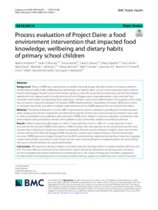 Project DAIRE was a randomised-controlled, factorial design trial which aimed to improve children’s health-related quality of life, wellbeing, food knowledge and dietary habits via two multi-component interventions: Nourish and Engage. Nourish was an intervention aiming to alter the school food environment, provide food-based experiences and expose pupils to locally produced foods. Engage was an age-appropriate cross-curricular food education intervention incorporating food, agriculture, nutrition science and related careers. The purpose of this study was to conduct a process evaluation to evaluate DAIRE implementation, mechanisms of impact (MOI) and context to elucidate trial results, and inform scalable implementation of the DAIRE approach for successful future rollout.