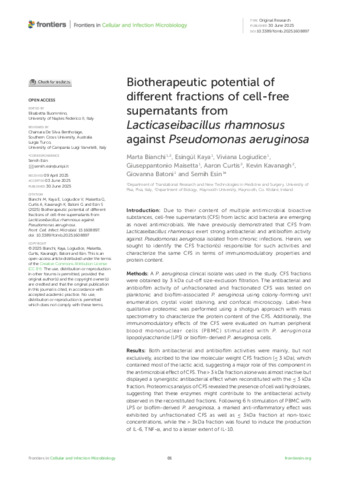 Bianchi, Marta, Kaya, Esingül, Logiudice, Viviana, Maisetta, Giuseppantonio, Curtis, Aaron, Kavanagh, Kevin, Batoni, Giovanna and Esin, Semih (2025) Biotherapeutic potential of different fractions of cell-free supernatants from Lacticaseibacillus rhamnosus against Pseudomonas aeruginosa. Frontiers in Cellular and Infection Microbiology, 15. ISSN 2235-2988