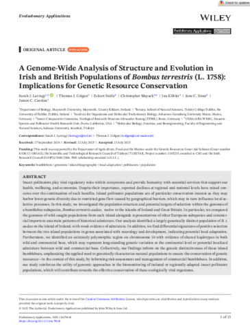 Larragy, Sarah J., Colgan, Thomas J., Stolle, Eckart, Mayack, Christopher, Köhler, Ina, Stout, Jane C. and Carolan, James C. (2025) A Genome‐Wide Analysis of Structure and Evolution in Irish and British Populations of Bombus terrestris (L. 1758): Implications for Genetic Resource Conservation. Evolutionary Applications, 18 (8). ISSN 1752-4571