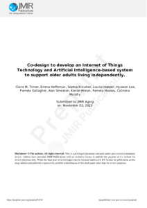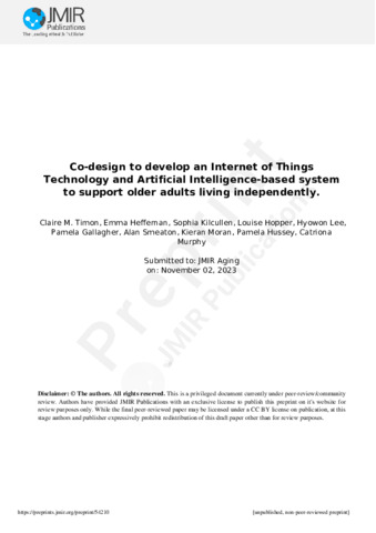 Timon, Claire M, Heffernan, Emma, Kilcullen, Sophia, Hopper, Louise, Hyowon, Lee, Gallagher, Pamela, Smeaton, Alan F, Moran, Kieran, Hussey, Pamela and Murphy, Catriona (2023) Co-design to develop an Internet of Things Technology and Artificial Intelligence-based system to support older adults living independently. JMIR Preprints. pp. 1-21.