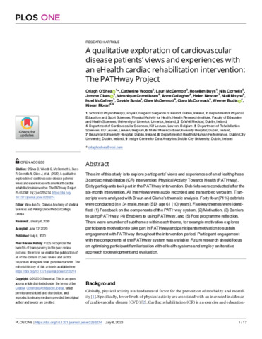 O’Shea, Orlagh, Woods, Catherine, McDermott, Lauri, Buys, Roselien, Cornelis, Nils, Claes, Jomme, Cornelissen, Véronique, Gallagher, Anne, Newton, Helen, Moyna, Niall, McCaffrey, Noel, Susta, Davide, McDermott, Clare, McCormack, Ciara, Budts, Werner and Moran, Kieran (2020) A qualitative exploration of cardiovascular disease patients’ views and experiences with an eHealth cardiac rehabilitation intervention: The PATHway Project. PLoS ONE, 15 (7): e0235274. pp. 1-17. ISSN 1932-6203