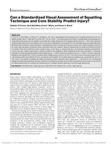 O’Connor, S, McCaffrey, N, Whyte, EF, and Moran, KA. Can a standardized visual assessment of squatting technique and core stability predict injury? J Strength Cond Res 34(1): 26–36, 2020—This study examined whether a standardized visual assessment of squatting technique and core stability can predict injury. Male adolescent and collegiate Gaelic players ( n = 627) were assessed using the alternative core/trunk stability push-up test and a developed scoring system for the overhead squat and single-leg squat (SLS) that examined both overall impression and segmental criteria. A single summative score from the overall impression scores of all 3 tests was calculated. Sustained injuries were examined over a season. Results indicated that the single summative score did not predict those that sustained a lower-extremity injury, trunk injury, or whole-body injury, and receiver operating characteristic curves were also unable to generate an optimal cutoff point for prediction. When segmental criteria were included in multivariate analyses, the tests were able to predict whole-body injury ( p < 0.0001) and lower-extremity injury ( p < 0.0001). However, although specificity was high (80.6%, 76.5%), sensitivity of the models was low (40.2%, 44.2%). The most common score was “good” for the overhead squat (46.4%) and SLS (47.6%), and “good” and “excellent” for the alternative core stability push-up test (33.5%, 49.1%), with “poor” core stability increasing the odds of sustaining a lower-extremity injury (odds ratio = 1.52 [0.92–2.51]). The findings suggest that although segmental scoring could be incorporated by strength and conditioning coaches and clinicians, they should be used predominantly as a preliminary screening tool to highlight players requiring a more thorough assessment.